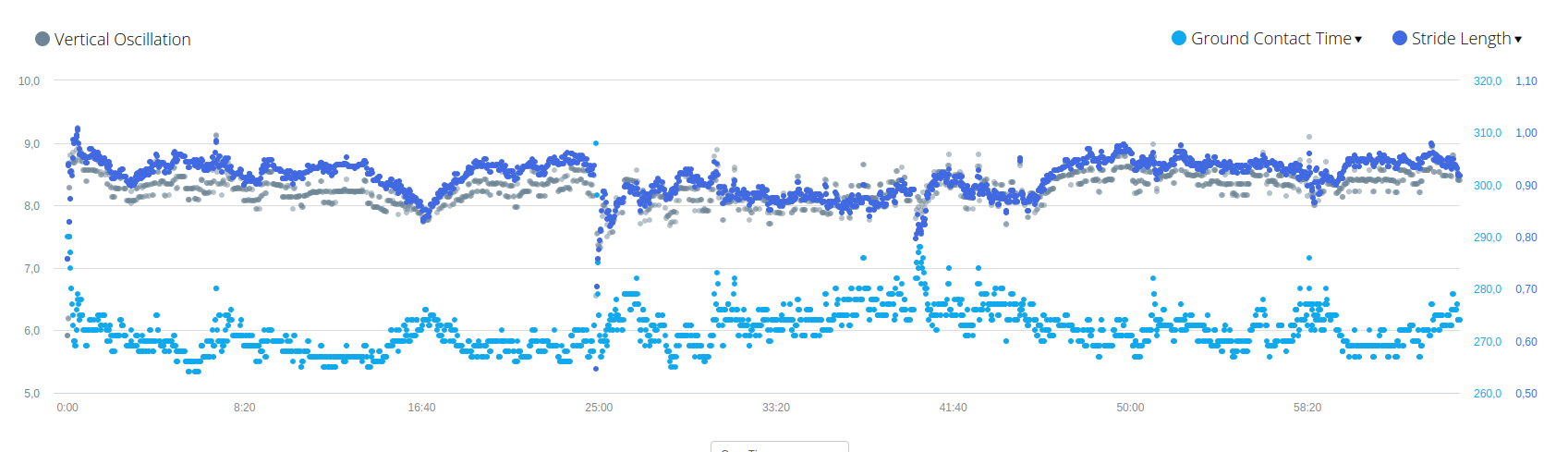 заметная разница в цифрах только у двух показателей: длина шага и время контакта с землей. Босиком шаг получался короче (не очень-то и заметно на графике, но минус три сантиметра с каждого шага :), а на земле я проводил времени больше: