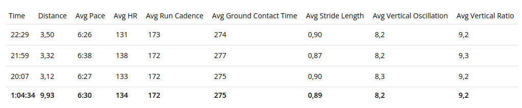 - Длина шага стала меньше, что логично, раз при том же каденсе мой темп упал. Но то, что это случилось при одинаковом ощущении и пульсе, говорит о том, что эти дополнительные усилия ушли на преодоление босиковости вместо продвижения вперед.